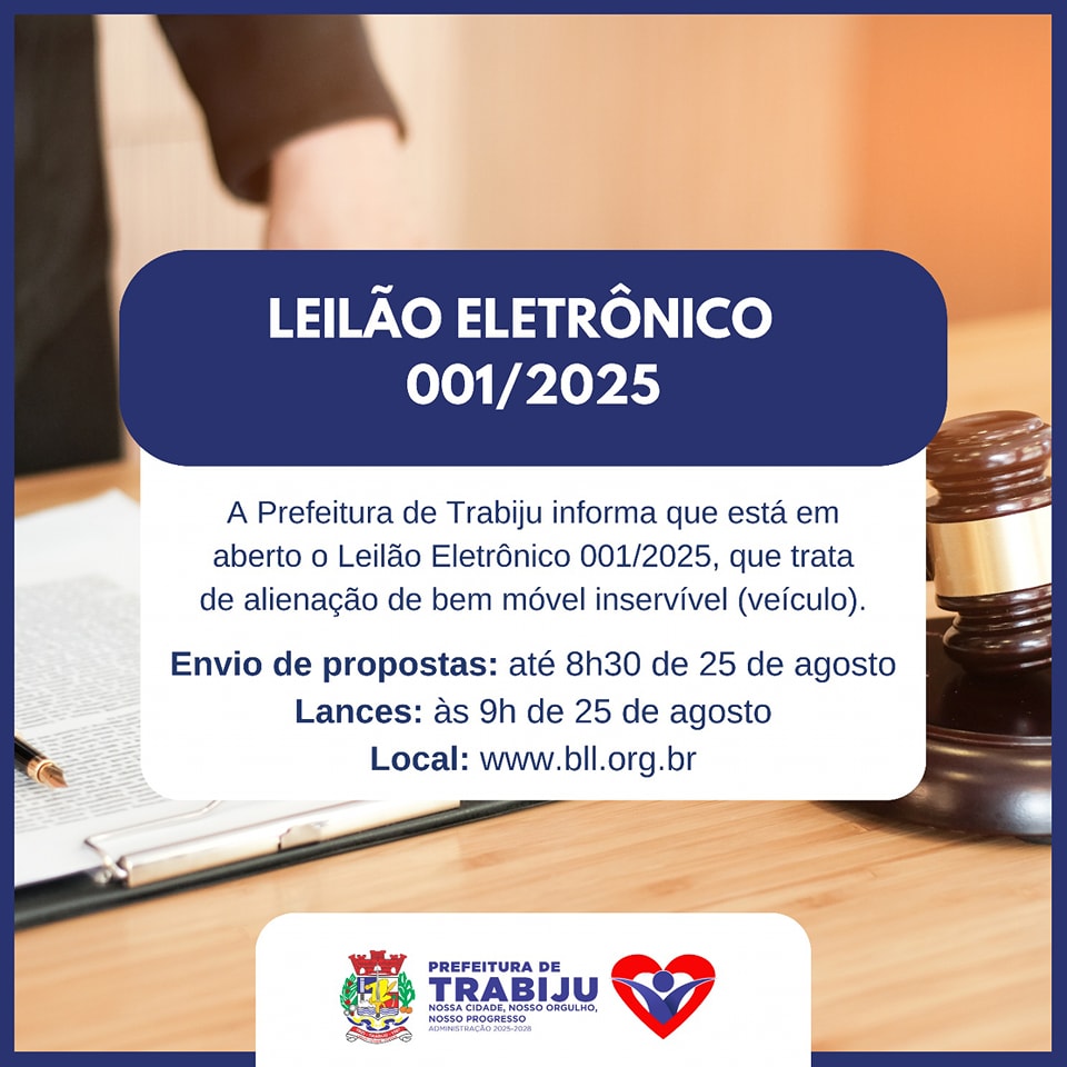 A Prefeitura de Trabiju informa que está aberto o Leilão Eletrônico 001/2025, referente à alienação de bem móvel inservível (veículo).