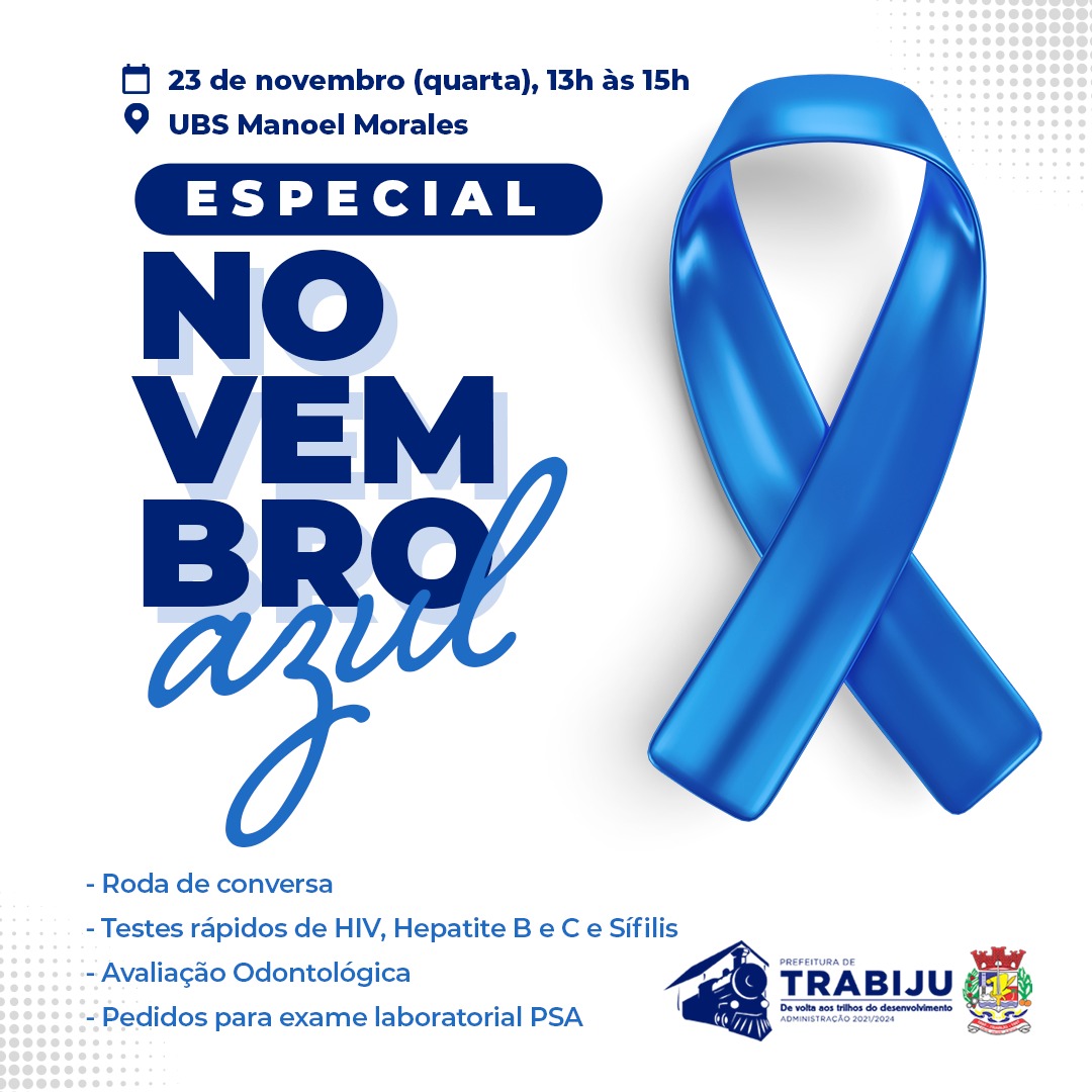 A Prefeitura de Trabiju, por meio do Departamento de Saúde, realizará o Especial Novembro Azul no dia 23 de novembro. Uma iniciativa para que faz parte da campanha de combate e prevenção ao câncer de próstata.